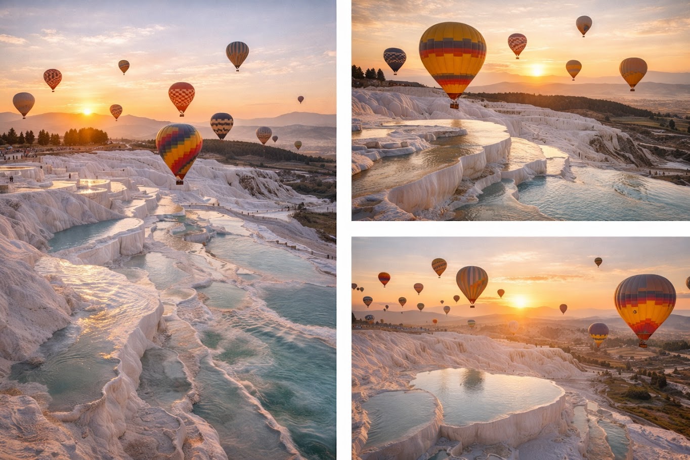 Odkryj niezwykłe piękno Pamukkale z lotu ptaka podczas niezapomnianego lotu balonem! Unosząc się nad białymi tarasami trawertynowymi i starożytnymi ruinami Hierapolis, podziwiaj widoki jednego z najbardziej unikalnych krajobrazów Turcji, wpisanego na Listę Światowego Dziedzictwa UNESCO.
